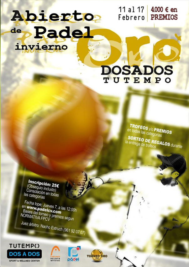 Otro nuevo torneo de pádel en Valencia, esta vez lo tenemos en Dos a dos-tutempo Quart entre los dias 11 y 17 de febrero. Los torneos de oro son los más importantes de la Comunidad Valenciana y la prueba de ellos es que hay una cifra de 4.000 euros en premios.