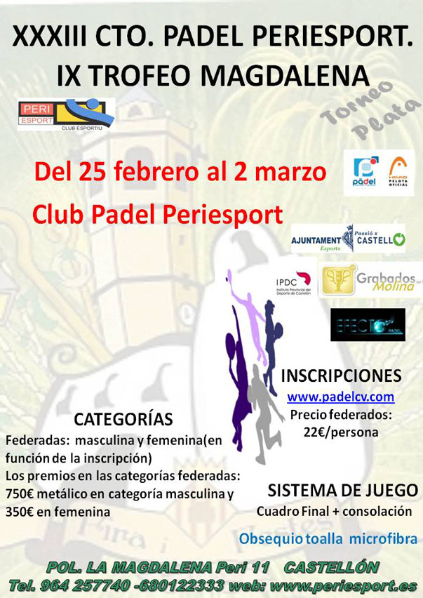 Nuevo torneo de pádel en Castellón, se disputará en el Club de Pádel Periesport situado en el poligono la Magdalena del 28 de Febrero al 2 de Marzo. En el podrán jugar las categorias federadas masculina y femenina con un premio de 750 euros en metalico para los chicos y 350 euros para las chicas.