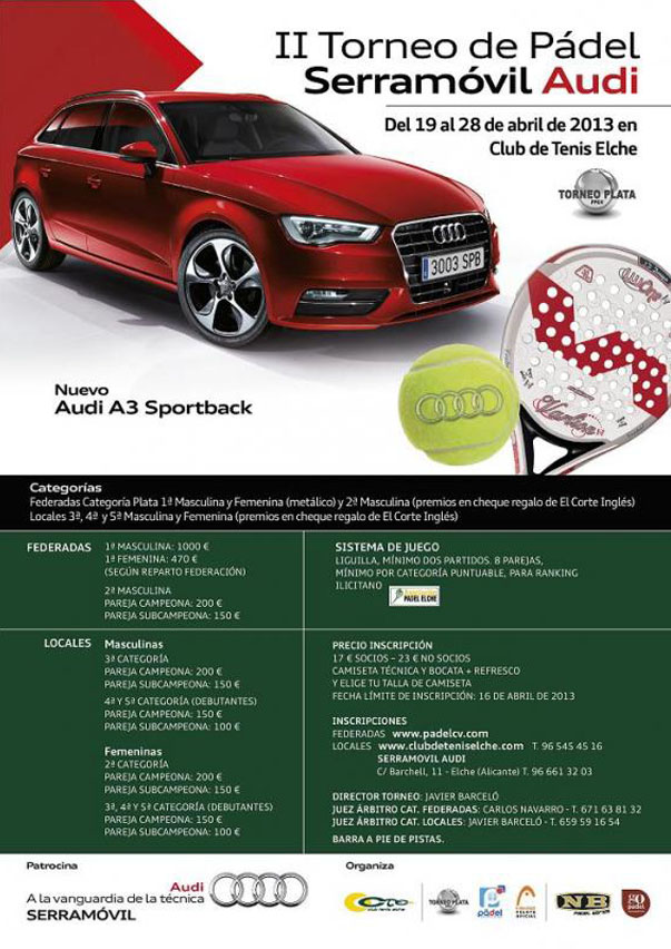 Del 19 al 28 deabril de este 2013 dará lugar el II Torneo de pádel Serramóvil Audi en el Club de Tenis de Elche. Es un torneo de padel plata en el cual podran participar las categorias federadas 1ª,2ª masculina y segunda femenina. Sin embargo el la categoria sin federar participaran 3ª,4ª, 5ª masculina y 2ª,3ª,4ª,5ª femenina.