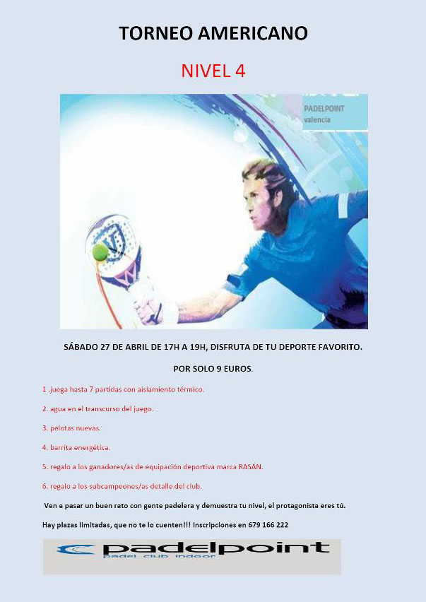 Nuevo torneo de pádel en las instalaciones del Club Padelpointindoor de Valencia.  El torneo se dispurá el proximo 27 de Abril de 2013 de 17 a 19 horas, para solo una categoria mixta nivel 4. El sistema de juego será el del torneo americano haciendo que dos parejas lleguen a un total de 7 partidos.