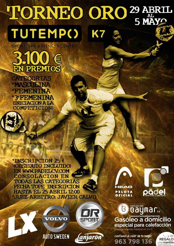 Proximo torneo de padel Oro en Tutempo K7 en Paterna ( Valencia ) entre el 29 de abril y el 5 de mayo. Con una cantidad de 3.100 euros en premios, repartida en las diferentes categorias. Las categorias con las que se podran participar son Categoria masculina , femenina y 3ª femenina( iniciación ). Esta ultima no podra optar a los premios en metalico.