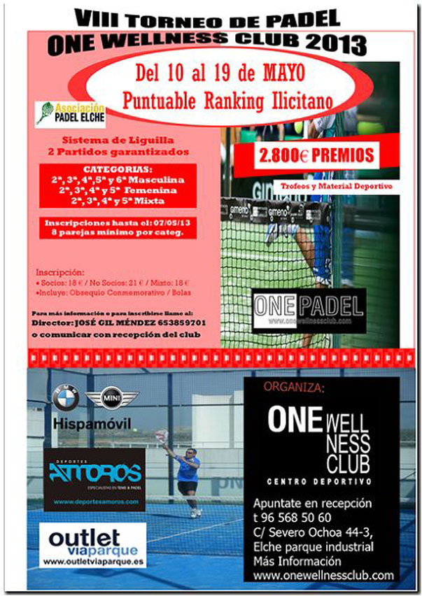 Nuevo torneo de padel One Wellness Club 2013 en Elche promovido por la asociación de Pádel Elche para los dias del 10 al 19 de mayo de este mismo año. El torneo será puntuable para el ranking ilicitano además de funcionar por un sistema de liguilla que garantizará los dos partidos como minimo para los participantes. En el podran participar  hasta 13 categorias: Masculina: 2ª, 3ª, 4ª, 5ª y 6 (que es la Principiantes) Femenina: 2ª, 3ª, 4ª y 5ª (Principiantes) Mixta: 2ª, 3ª, 4ª y 5ª.