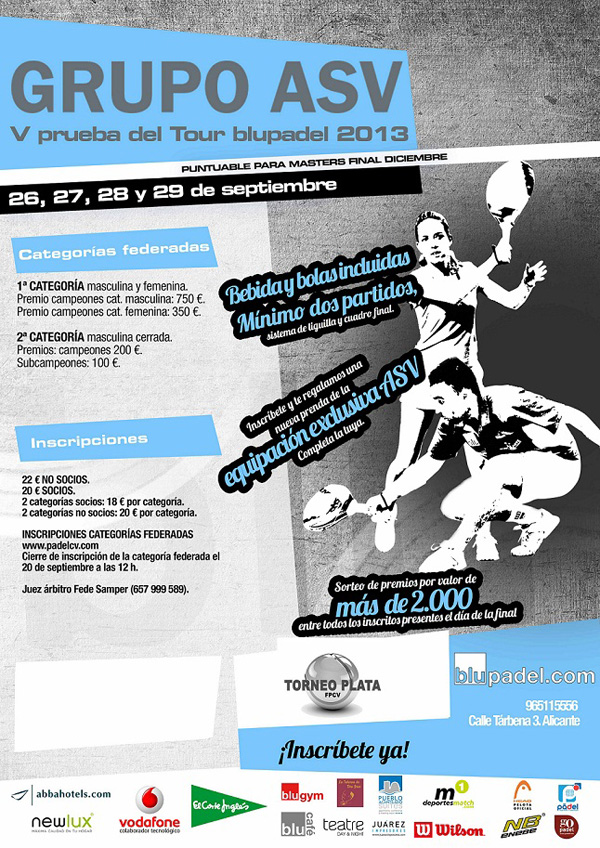 Torneo de Pádel Plata Grupo Asc , es la V prueba del Tour Blupadel 2013, con grandes premios entre todos los participantes, en primera categorías 750€ para los campeones y en segunda 200€, todas las parejas tendrán de regalo bebida y bolas además de una equipación exclusiva de ASV