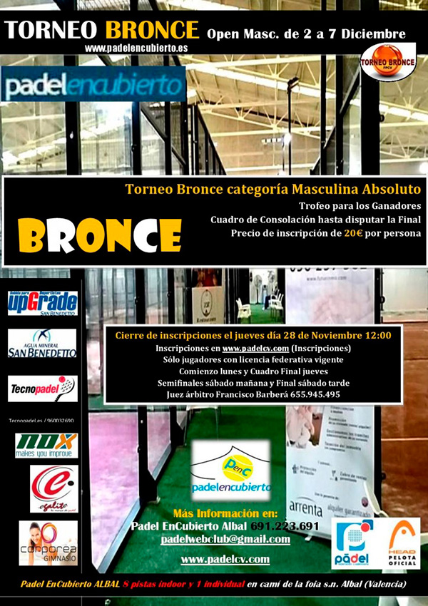 Torneo de pádel bronce en el club de pádel Padelencubierto , instalaciones situadas en Albal (Valencia), que cuenta con 8 pistas de pádel y repite en la organización de torneos de este tipo que tanto éxito les ha traido.