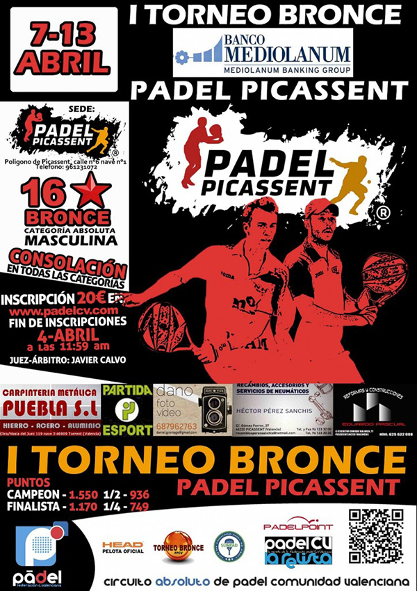El Torneo de pádel Bronce se celebrará del 7 de Abril al 13 de Abril. En las instalaciones del Club de pádel Picassent situado en el polígono de picassent.