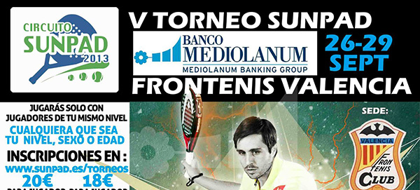 V Torneo Sunpad del 26 al 29 de Septiembre en Valencia Frontenis, club de pádel en Valencia con unas instalaciones al aire libre en un entorno idílico, muy recomendable.